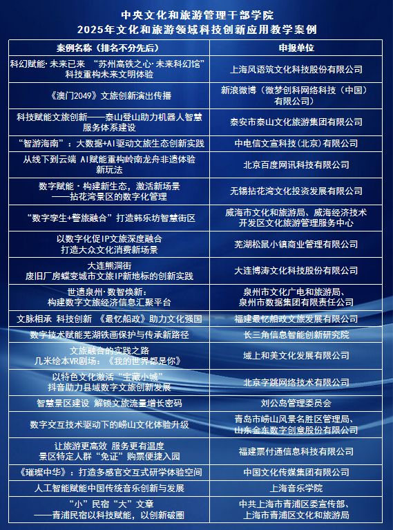 今年是学院连续第二年征集发布文化和旅游领域科技创新应用教学案例。入选案例深度聚焦数智时代文化和旅游发展共性问题,全面反映当前文化和旅游领域科技创新应用的有益探索、创新举措、经验成效,对于培训教学、行业研究都具有重要参考价值。