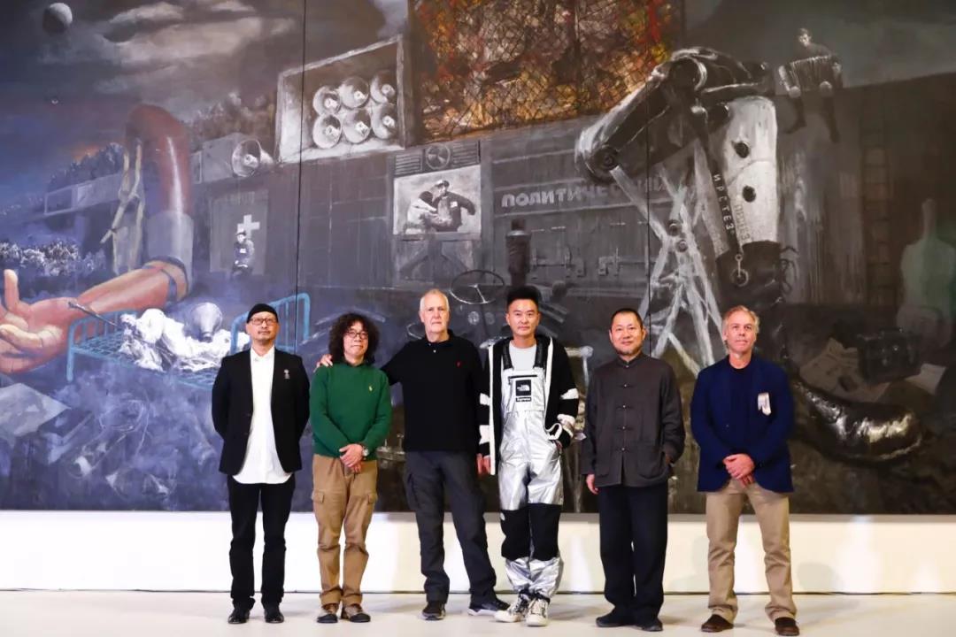 现场嘉宾合影。从左至右依次是独立策展人 、美术评论家冯博一,艺术家、四川大学艺术学院教授、博士生导师何工,澳大利亚艺术批评家、媒体人Michael James ,域上和美集团、域上和美文旅股份有限公司董事长邱伟,喜玛拉雅美术馆理事会理事长、创始馆长沈其斌,亚利桑那州州立大学艺术系终生教授Mark Vincent