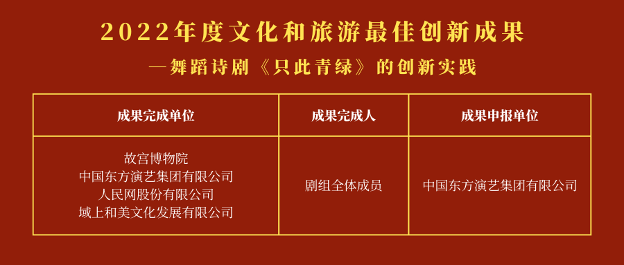 经文化和旅游部组织形式审查、初评、答辩终评、实勘、评审委员会审议、公示等工作,确定舞蹈诗剧《只此青绿》的创新实践为2022年度文化和旅游最佳创新成果。