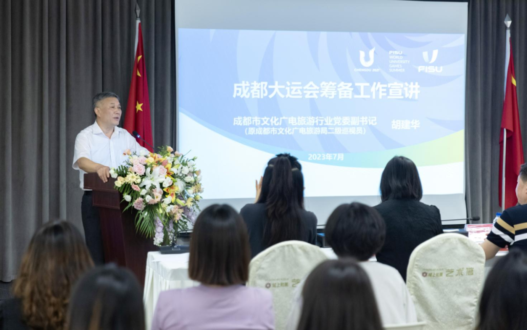 胡建华讲到,成都大运会是党的二十大胜利召开后国内举办的首个世界级大型体育赛事,也是西部地区首次承办的综合性国际体育赛事。办好大运会是党中央、国务院交给成都的重大政治任务,省委省政府、市委市政府高度重视成都大运会筹备工作。他希望广大文旅行业从业者、特别是广大党员要踊跃参与进来,一起当好东道主、做好主人翁,干好分内事、办好大运会,努力向世界呈现一届具有中国特色、彰显时代风采、展现巴蜀韵味的国际体育盛典。