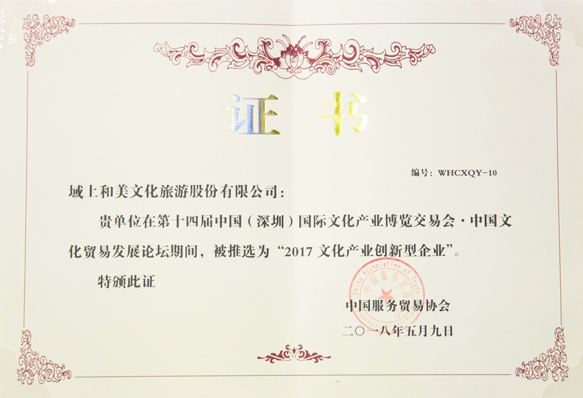 尤值一提的是,在本届文博会上发布了第十届“全国文化企业30强”及20家提名企业榜单,域上和美文旅股份成为西部唯一被提名的民营文化企业,进入中国文化企业第一方阵。同时,在5月9日举办的中国文化贸易发展论坛暨文化双创大赛上,域上和美文旅股份有限公司还被授予“2017文化产业创新型企业奖”。