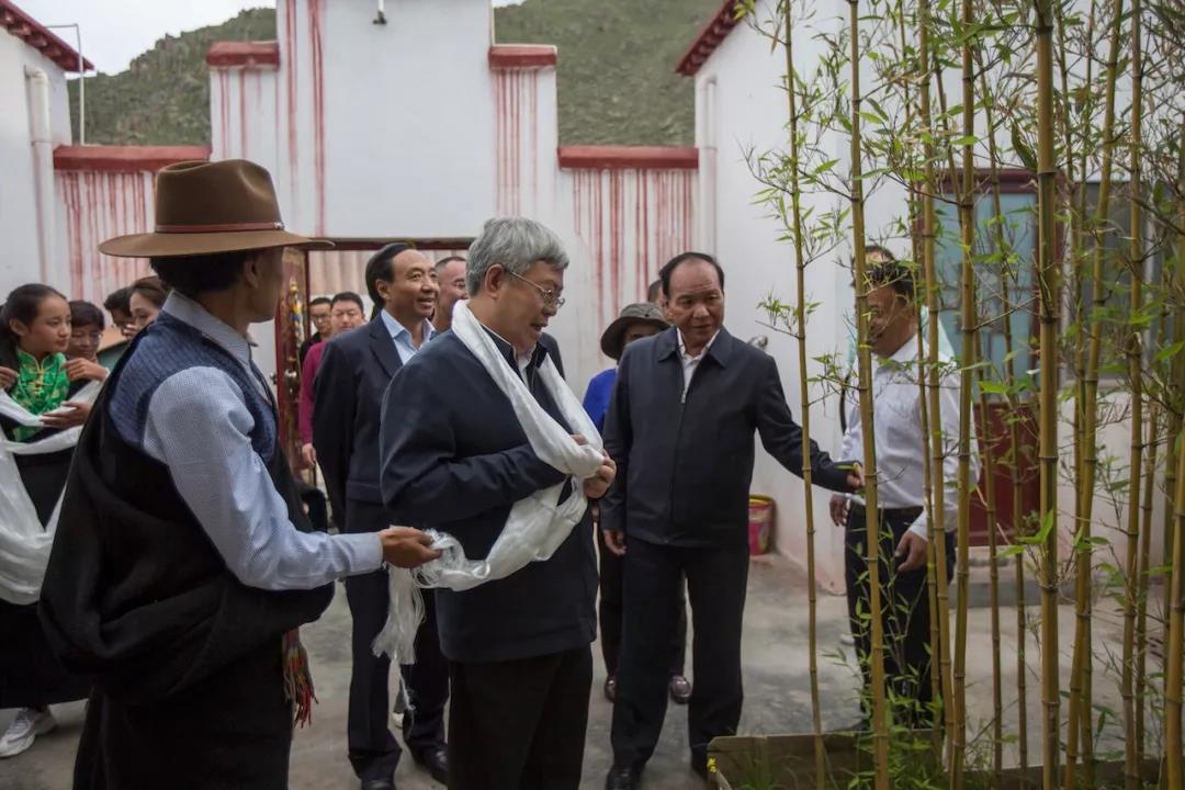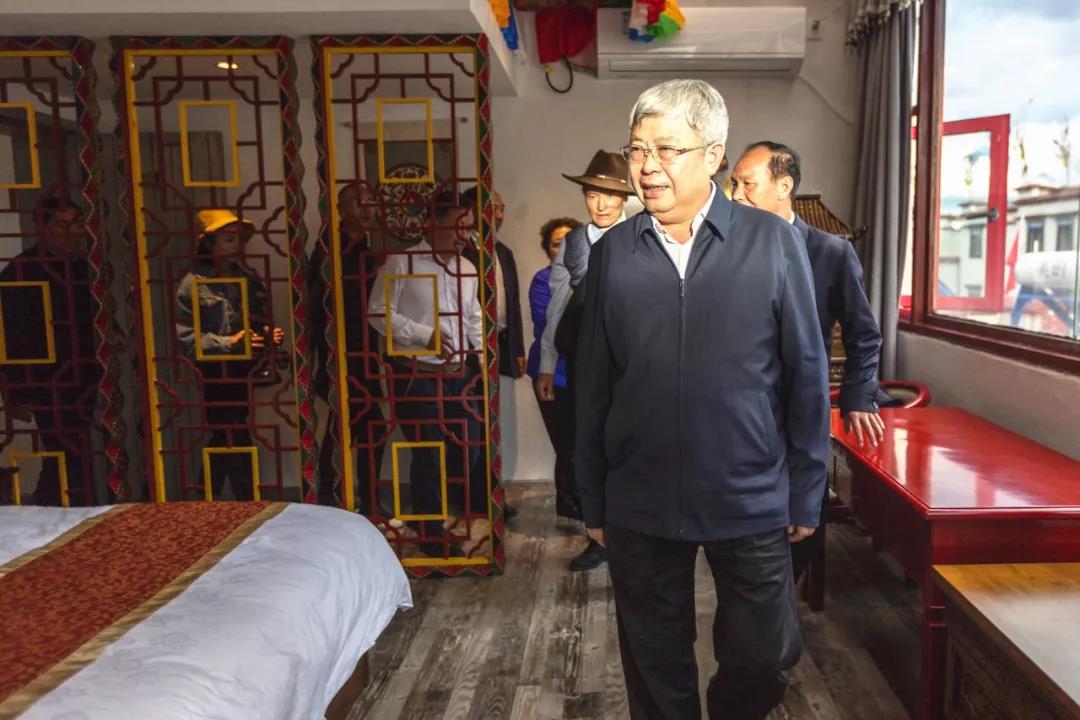 考察中,环境优美的藏式小院、整洁舒适的藏家民宿受到刘永富一行关注。在村民巴桑占堆家,刘永富详细询问了现在的生活状况和旅游增收情况。当了解到巴桑占堆家的民宿已开始接待客人入住,并在最近一个季度中进行了分红,刘永富十分欣慰。廖强介绍到,“德吉藏家”项目通过发展特色旅游产业,促进易地搬迁扶贫就业增收,并采用政府+合作社+专业企业“三位一体”的运营模式,村民们可通过就业、入股分红和销售农副产品及手工艺品等方式实现多源创收。刘永富对该运营模式表示高度肯定,嘱咐在改善村民生活条件的同时,更要重视对其观念转变的引导,既要扶贫增收,更要扶智扶志巩固脱贫。
